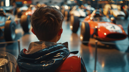Rear view of little boy looking at vintage cars in exhibition hall