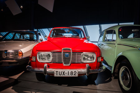 Red Saab 96 with TUX 182 plate in indoor auto museum display