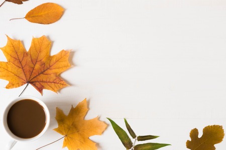 Autumn banner. Frame design for text on a white wooden background with autumn dry leaves and a cup of coffee. Autumn mood. Background for a banner with natural leaves. Flat lay, top view. Autumn flat background with coffee.