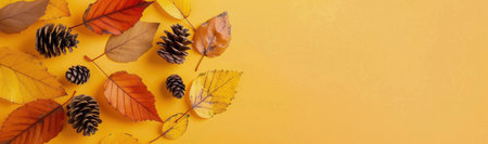 Colorful autumn leaves in shades of orange and red, along with pinecones, are scattered on a vibrant yellow surface, creating a warm and seasonal display.