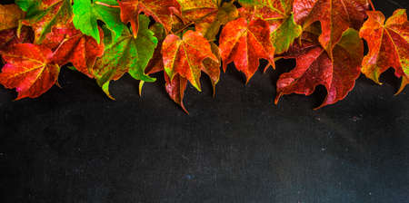 Bright autumnal leaves on chalkboard with copyspace