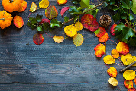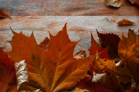 Colorful autumn leaves, yellow, orange and red over a wooden background
