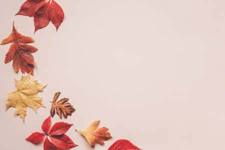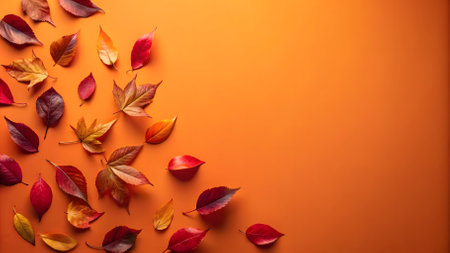 Colorful autumn leaves on orange background. Top view, copy space