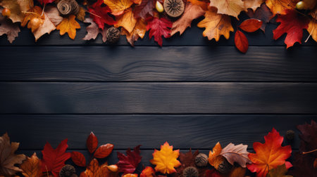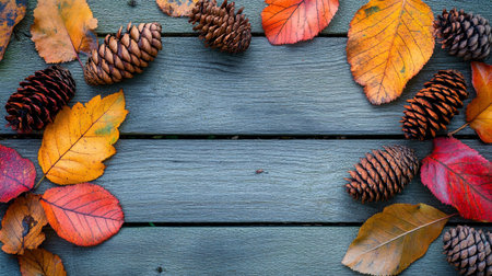 Autumn leaves and pine cones on rustic wooden background with copy space