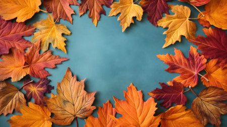 A beautiful frame of autumn leaves on a teal background. Perfect for fall decorations and seasonal designs.