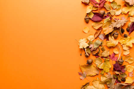 Collection beautiful colorful autumn leaves, cones, on oranges background. copy space.