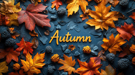 Word Autumn surrounded by colourful maple leaves on dark background. Seasonal theme frame, harvest and Thanksgiving.