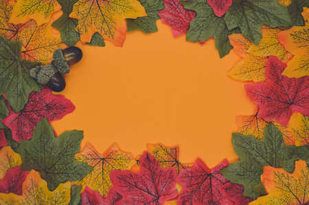 Autumn background with acorns, red, orange and green leaves on orange background. Blank for a cover, presentation, banner or postcard. View from above. Space for text. Toned image with soft focus