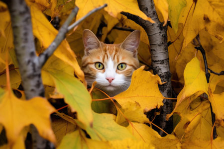 AI Generated. Cute cat hiding in bright autumn foliage