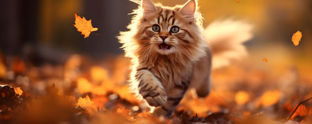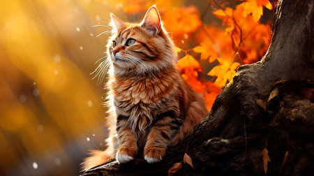 Frolicking feline enjoying a vibrant autumn scene filled with golden foliage. Concept Autumn Adventures, Feline Frolic, Vibrant Foliage, Nature's Beauty