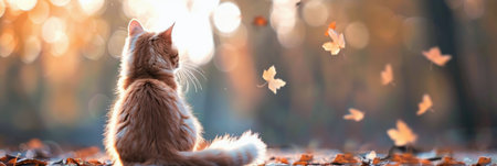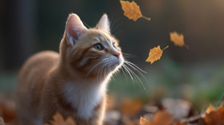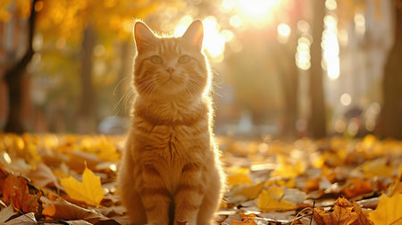 An orange cat sits quietly among fallen leaves, gazing at the warm sunset glow. The soft light highlights the cat's fur while orange and yellow leaves dance in the gentle breeze.