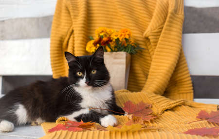 black and white cat with yellow eyes is lying on a white wooden bench on a mustard-colored knitted sweater. autumn maple leaves lie nearby, in the background a bouquet of orange flowers