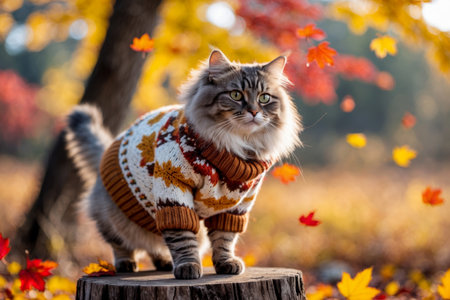 AI Generative Cute cat in knitted sweater on autumn forest background, animal in red and yellow foliage
