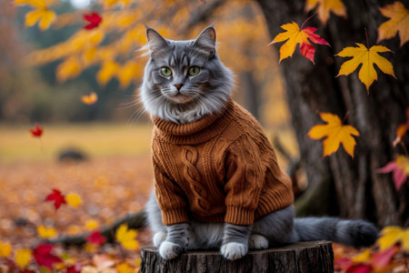 Cute cat in sweater sitting in autumn forest with yellow maple leaves