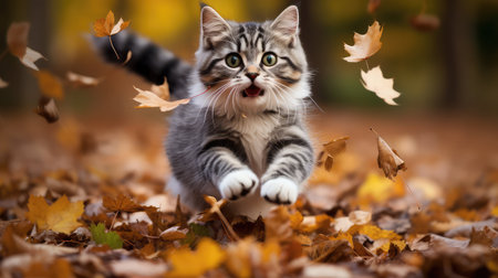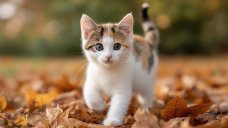 A charming and playful kitten wanders through a bed of vibrant autumn leaves, showcasing its curiosity and lively spirit against a serene outdoor background.