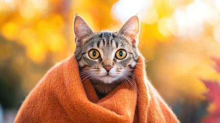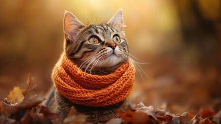 Close-up of a tabby cat wrapped in a knitted orange scarf, sitting in a pile of autumn leaves with a dreamy, golden background