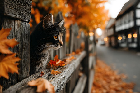 A cat peers through a rustic wooden fence, surrounded by vibrant orange autumn leaves. the scene essence of a quaint village street adorned with half-timbered houses, evoking a warm and cozy atmosphere. Generative AI