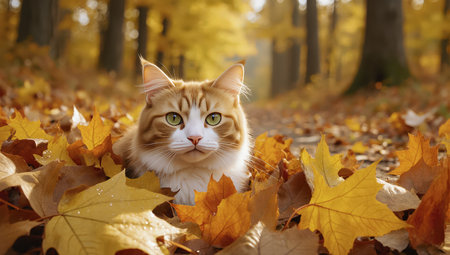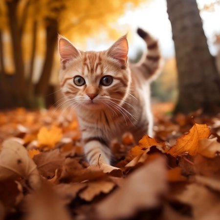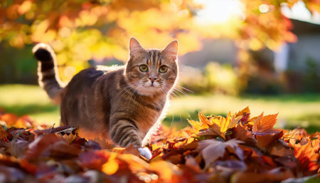 A playful feline navigates through a carpet of vibrant autumn leaves, enjoying the warm sunlight.