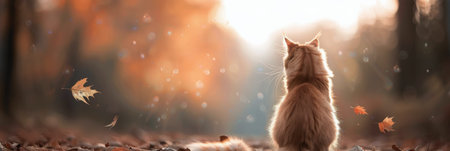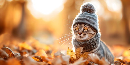 autumn banner with adorable cat wearing a cozy hat and scarf in a golden forest - ideal for seasonal promotions with ample space for your text