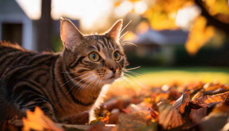 A playful tabby cat explores colorful leaves in a sunny autumn backyard.