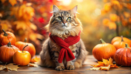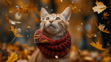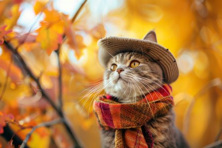 Charming cat in hat and scarf on autumn backdrop with ample room for text placement