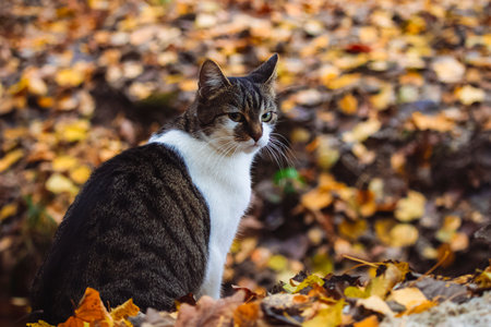 Tabby Cat Sitting Among Fallen Leaves in an Autumn Park with Warm Lighting. High quality photo