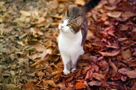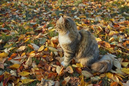 Cat in autumn sunny day, against the background of fallen leaves