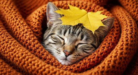 A peaceful tabby cat soundly sleeping, nestled within a warm orange knitted blanket with an autumn leaf on its head.