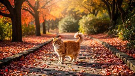 A fluffy ginger cat walks confidently along a stone path covered in vibrant red and orange autumn leaves. Sunlight filters through the trees in the background, highlighting the cat's fur and the seasonal beauty of the park.