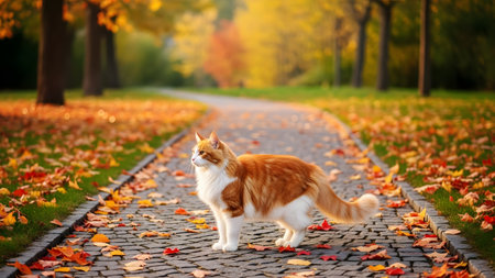 A majestic long-haired orange and white cat stands elegantly on a cobblestone path surrounded by fallen autumn leaves in a park. The background features blurred trees with yellow and orange foliage, capturing the beauty of the season.