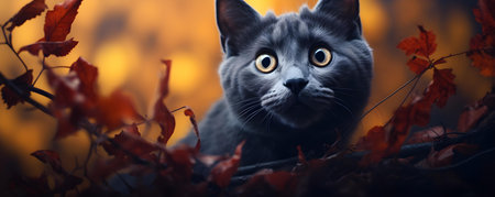Portrait of a cute grey cat in autumn leaves. Selective focus.