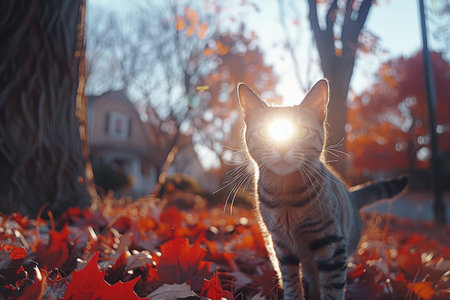 AI Generated. Playful cat walking through autumn leaves in urban park setting