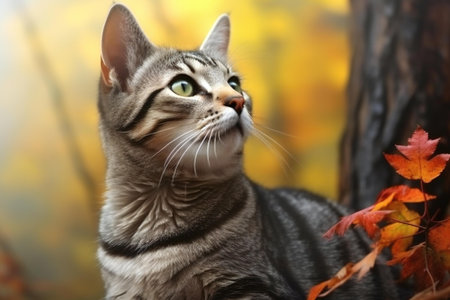 In a picturesque autumnal setting, a beautiful tabby cat camouflages amidst a carpet of vibrant fallen leaves The cat's keen gaze, framed by its expressive amber eyes, captures the essence of the season's warm hues and natural beauty This enchanting portrait showcases the harmony between nature and feline grace, creating a stunning seasonal image AI Generative