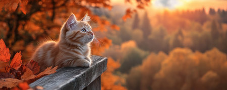 A captivating orange tabby kitten, perched on a wooden railing, gazes devotedly out the window Autumn leaves and a breathtaking forest backdrop frame this idyllic scene Bathed in the warm hues of the setting sun, this loyal feline friend embodies peaceful companionship and a strong connection to its surroundings AI Generative