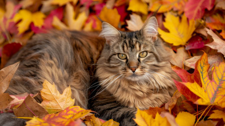 A plump cat lounging on a bed of colorful autumn leaves, blending with the natural beauty of the season