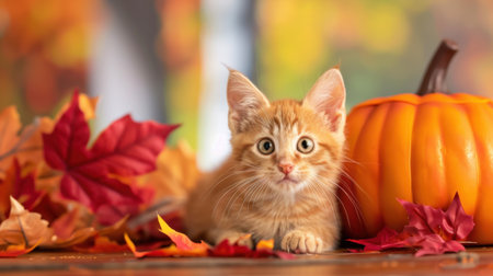 This charming image captures a playful orange kitten nestled among vibrant autumn leaves and a bright pumpkin, evoking the warmth and coziness of fall.
