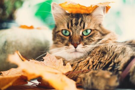 Cute Maine coon cat playing with autumn leaves, lying on rustic table with pumpkins. Adorable tabby cat with green eyes and funny interesting look . Thanksgiving or Halloween concept
