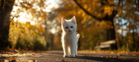 A white kitten stands on a paved park path surrounded by vibrant fall foliage. Golden hour sunlight filters through the trees, creating a warm and serene atmosphere.