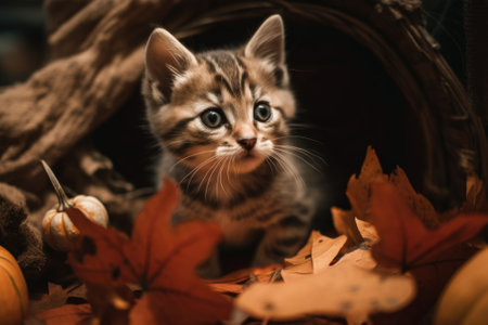 A kitten sitting in a pile of leaves. AI generative image.
