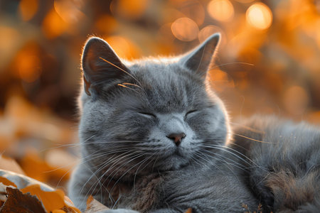 Contemplative cat is surrounded by warm fall foliage, creating a serene backdrop