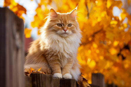 An adorable fluffy ginger cat sits regally on a wooden fence, surrounded by vibrant autumn leaves.