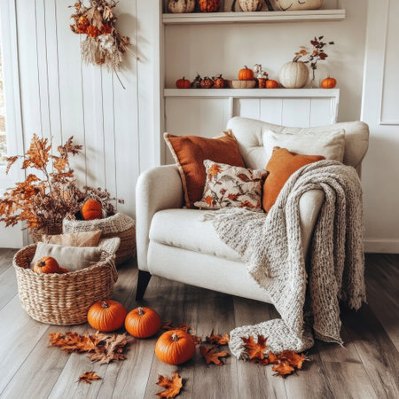 A cozy armchair with autumn-themed pillows and blankets, surrounded by pumpkins on the floor in front of it. The room is decorated for fall with white walls, wooden floors, and a shelf holding an orange flower arrangement. A woven basket filled with leaves adds to its warm ambiance. --v 6.1 Job ID: 5bb0b5ac-1e70-4224-8387-ded0abe57425