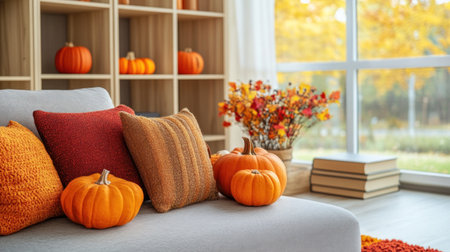 A cozy living room decorated for the fall season, featuring autumn-themed decor like pumpkins and colored pillows on a gray sofa. The space is well-lit with natural light coming through large windows, creating an inviting atmosphere. A wooden shelf in one corner holds various decorative items such as small vases filled with flowers or colorful objects. In front of it stands a soft carpet that adds to the warm ambiance. There's also a stack of books nearby. --chaos 30 --ar 16:9 --v 6.1 Job ID: 0bfc3b98-25e5-4fb0-98cd-7e32d2761cf0