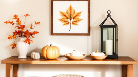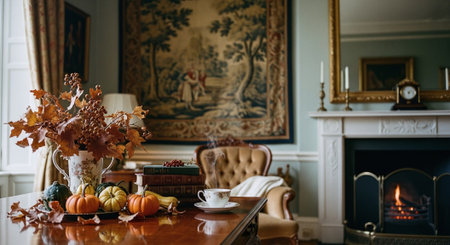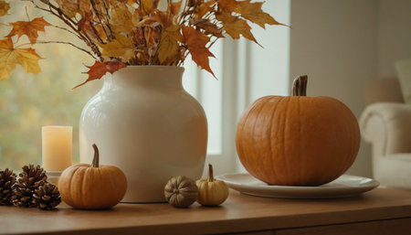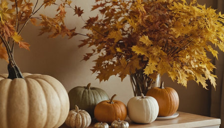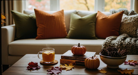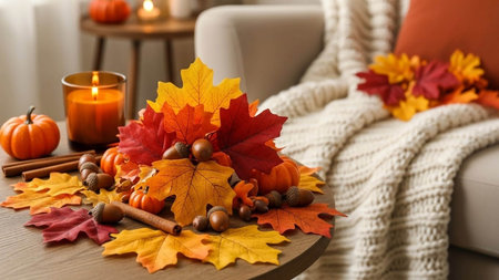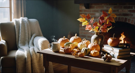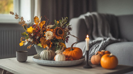 Thanksgiving and Harvest Festival. cozy living room adorned with autumnal decorations, such as pumpkins, gourds, and fall foliage, creating a warm and inviting atmosphere for Thanksgiving celebrations.