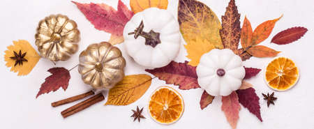 Multicolored leaves pumpkins and spices. Creative autumn layout.