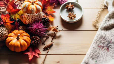 Autumn still life with pumpkins, candles and knitted plaid. selective focus. Generative AI