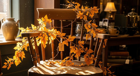 Wooden chair with autumn leaves in a cafe. Autumn still life