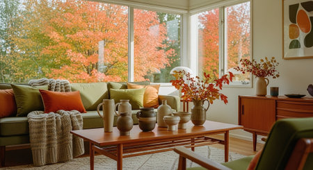 A cozy living room with modern decor, featuring large windows showcasing autumn foliage, stylish furniture, and decorative plants