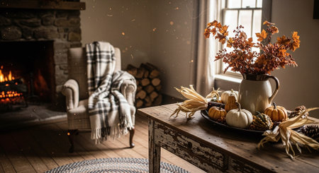 Autumn still life with pumpkins, corn, plaid and fireplace
