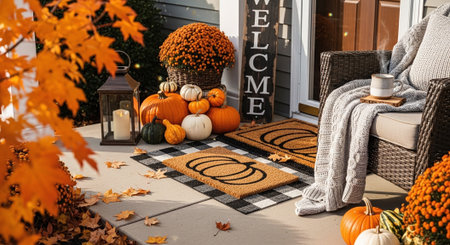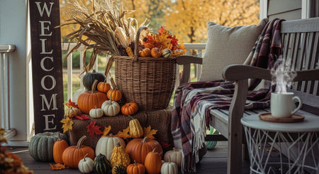 Autumn decor on porch of house with pumpkins and knitted blanket